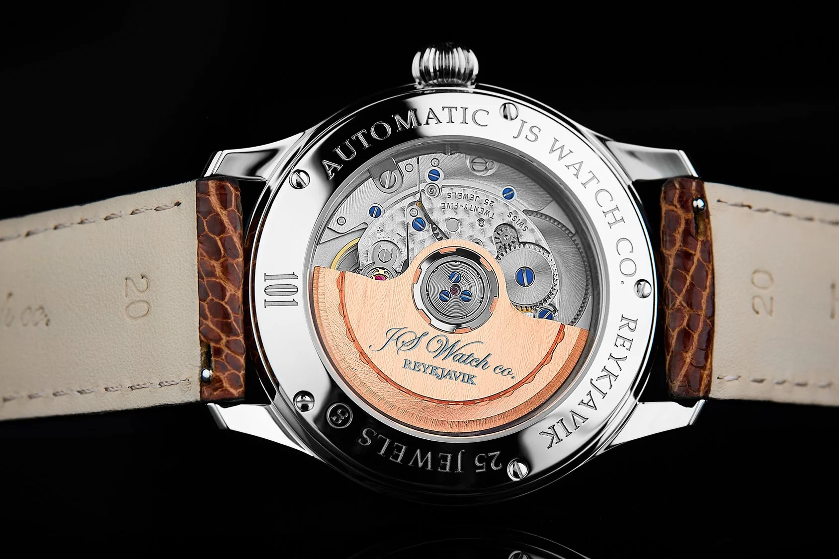 Powered by a Swiss Made Execution Top automatic movement and visible through a sapphire crystal case back, this timepiece offers mechanical precision with classic style. Limited to just 20 individually numbered pieces, this release embodies the exclusivity and timeless quality that define JS Watch Co. Reykjavik.