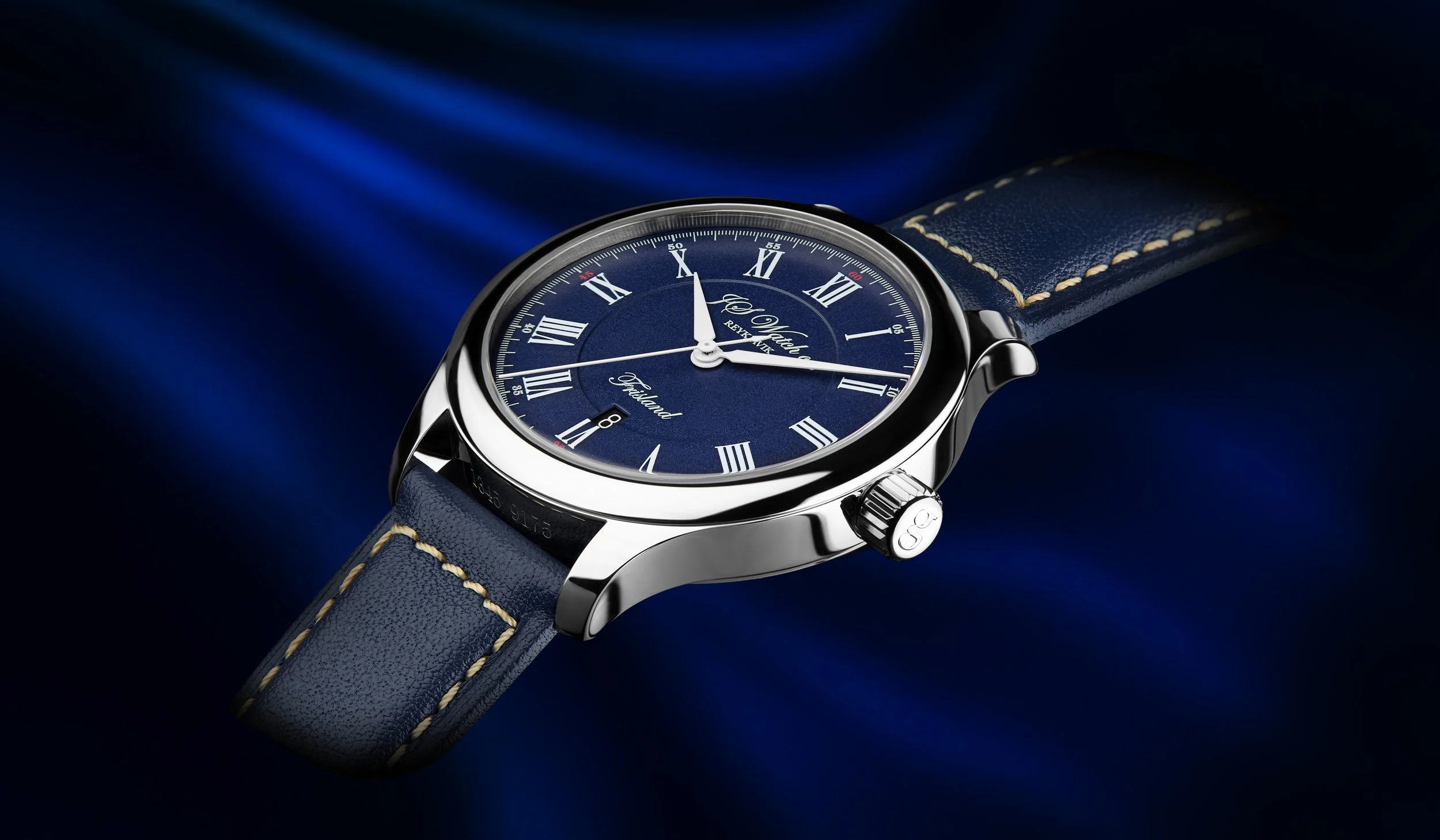 A deep navy blue dial with a soft frosted finish, paired with white lancette style hands and classic Roman numerals. The result is calm, legible, and quietly refined. A watch that reveals its character gradually, much like the North Atlantic itself.